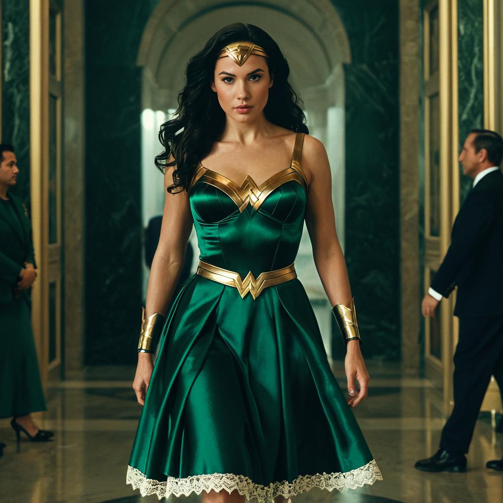 Realistic photo.1990s-style screengrab of Wonder Woman wearing a deep emerald green satin dress with lace details, A-line skirt. Fashion movie scene, Gucci commercial aesthetic, cinematic composition, richly colored with high fashion vibe.
