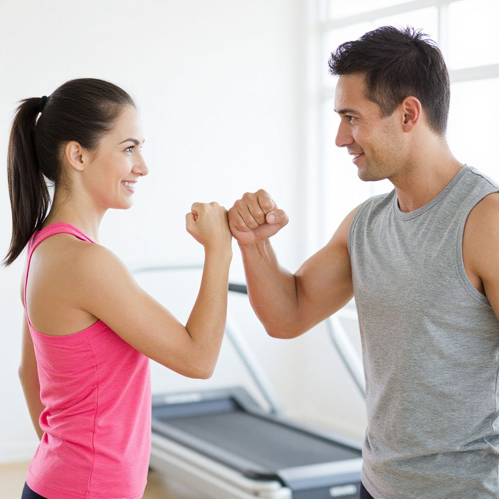 Photograph of a fit, smiling couple in a gym. The woman, with light skin, dark hair in a ponytail, and wearing a bright pink tank top, faces the man, who has light skin, short dark hair, and wears a gray sleeveless shirt. They are fist-bumping, both with clenched fists raised to chest level. In the background, there is a blurred treadmill. The bright white background emphasizes their focused, friendly expressions and athletic attire.