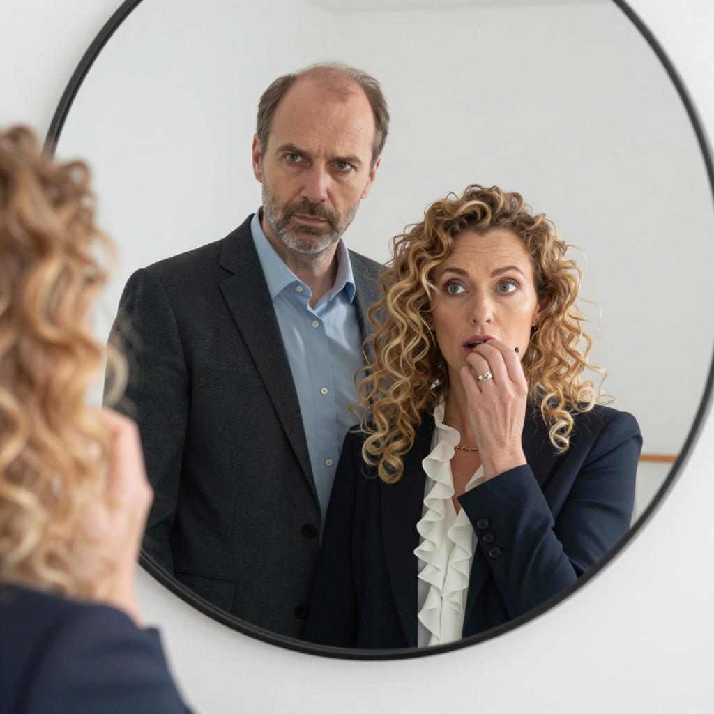 Man with receding hairline in dark suit, standing behind woman with curly blonde hair, wearing dark jacket and white ruffled blouse, looking into round mirror. Man's serious expression, woman's hand near mouth, slightly upward gaze. Two people, mirror in center.