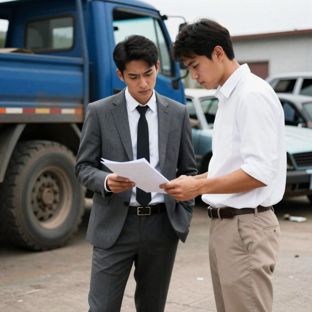 Photograph of a garage scene. Three men, two in white coveralls and one in a gray suit with a white cap. Red car with hood open in the background. Man in suit holds a black object, looking surprised. Two men in coveralls stand to his sides, one hands on hips, other hands in pockets. Bright fluorescent lights overhead.