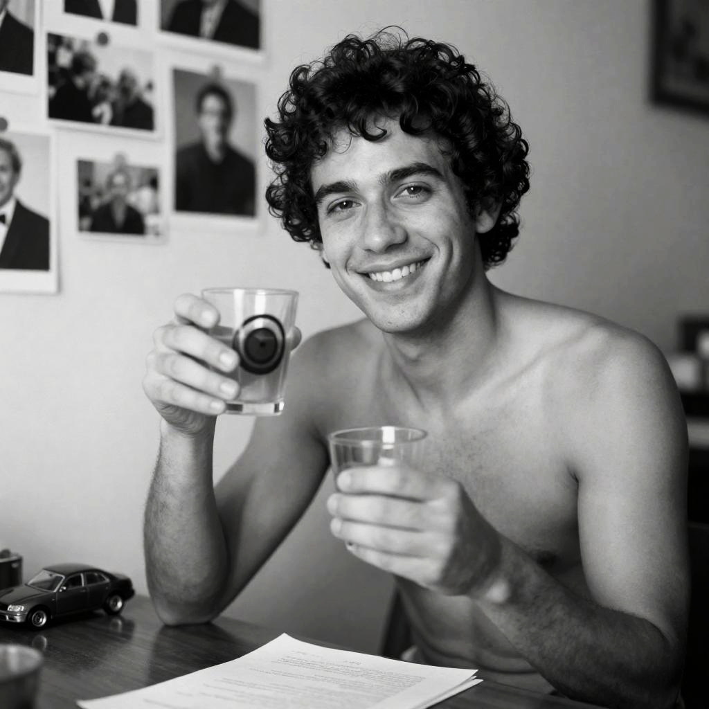 Black and white photograph of a smiling man with short dark hair and a mustache, wearing a light-colored shirt, loose jeans, and dark lace-up boots. He is hanging from a horizontal metal bar with both hands outdoors in a park-like setting with trees and grass in the background. The man has his legs raised, right foot higher than left.