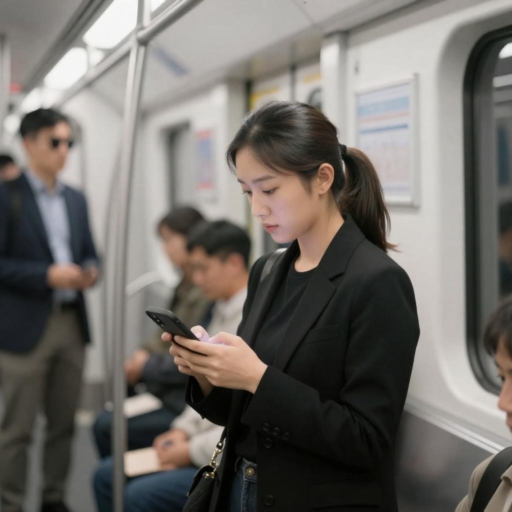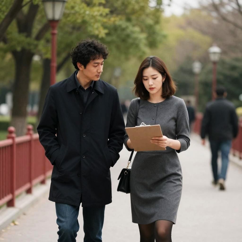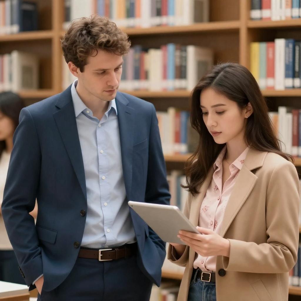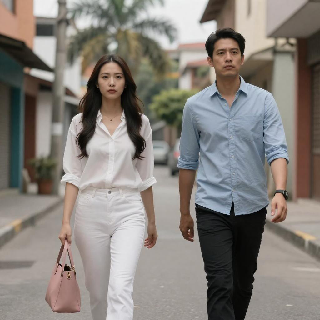 Photograph of a street scene. A woman with light brown hair in a pink blazer and black pants, holding a phone, walks alongside a man in a blue blazer and white shirt. Both look down at their phones. Background includes pedestrians, bicycles, and storefronts.