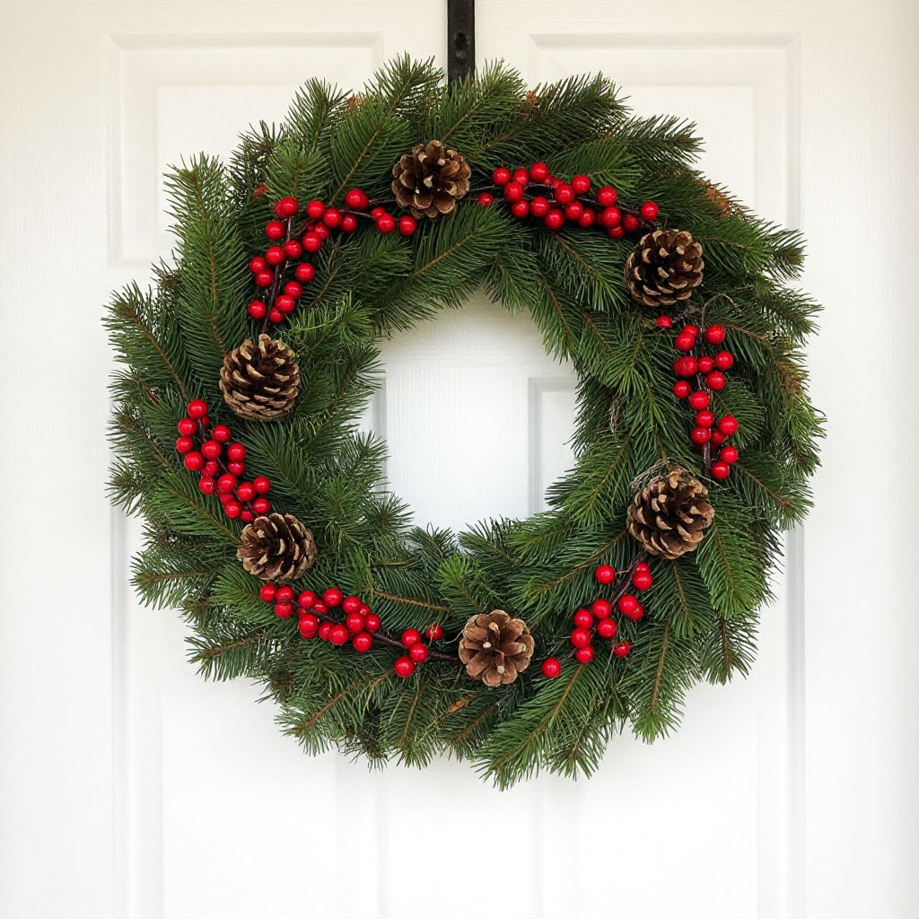 Circular wreath crafted from vibrant green pine branches, interspersed with clusters of glossy red berries and rustic brown pinecones, elegantly adorning a white paneled door.