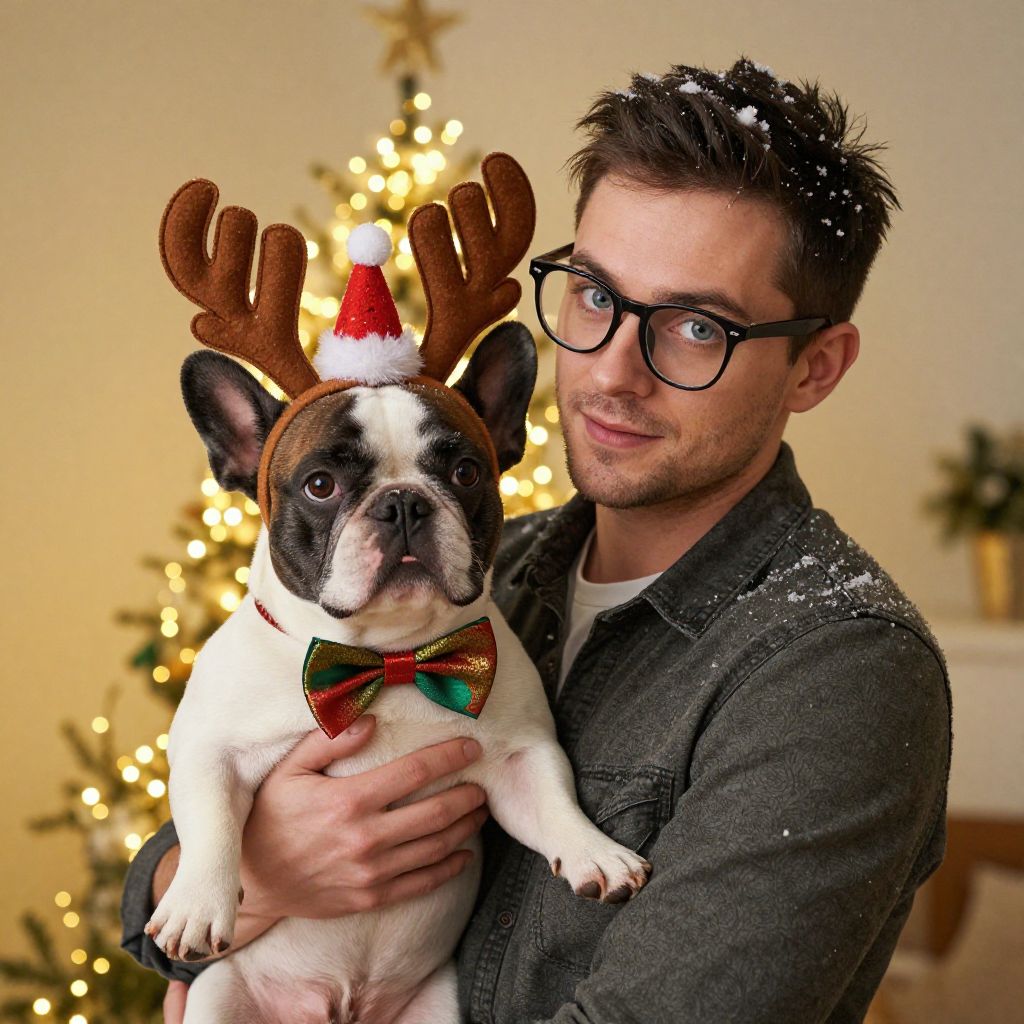 Intimate, cozy scene: A bespectacled man, dressed in casual attire, warmly holds a playful French Bulldog (Bouvier des Flandres) wearing adorable holiday accessories, such as reindeer antlers, Santa hat, or festive bow tie. Surrounded by twinkling LED lights, soft white snowflakes gently fall around Man has masculine face and piercing eyes