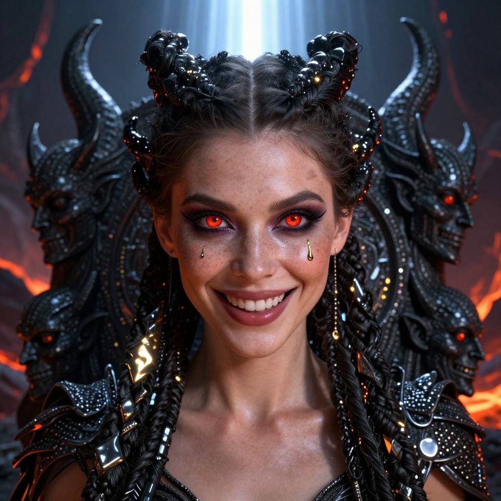 Full body:2Ilya Kuvshinov style, a soul eater basking in a beam of celestial light piercing a sultry, volcanic hell-scape. Playful shadows dance across her face, highlighting a dusting of sun-kissed freckles and iridescent party makeup, with a single teardrop of molten gold tracing a path down her cheek. Her majestic braids, woven with strands of obsidian and imbued with an inner glow, cascade down her back. Incredibly detailed close-up, focus on a mischievous grin that hints at both playful cruelty and undeniable charisma. Her piercing eyes, like pools of molten ruby, radiate an otherworldly allure. Casting seat, adorned with demonic visages and crafted from obsidian, hints at her power.futuristic, scifi, intricate, elegant, majestic, Masterpiece; award winning art, award-winning glamour photograph, civitai fusion style, brilliant composition, highly detailed; extreme, octane render, zbrush, blender, 3d, post-processing, HDR; lightning; volumetric; cinematic; ray tracing; RTX;radiant light rays, subsurface scattering, soft edge lighting, realistic shadows; deep shadows, vibrant colors, high-res, 8k, 16k, 32k