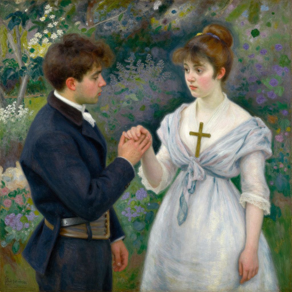 Pierre-Auguste Renoir, In the Garden, 1885, 170.5 cm × 112.5 cm, Oil on canvas. The look of the young man shows his intentions: he is asking for this young woman's hand and heart. Her response reflects her thoughts of the future. An unusual detail for Renoir here is the cross-worn by the young woman; it is placed in the center of the composition, creating the focused meaning.