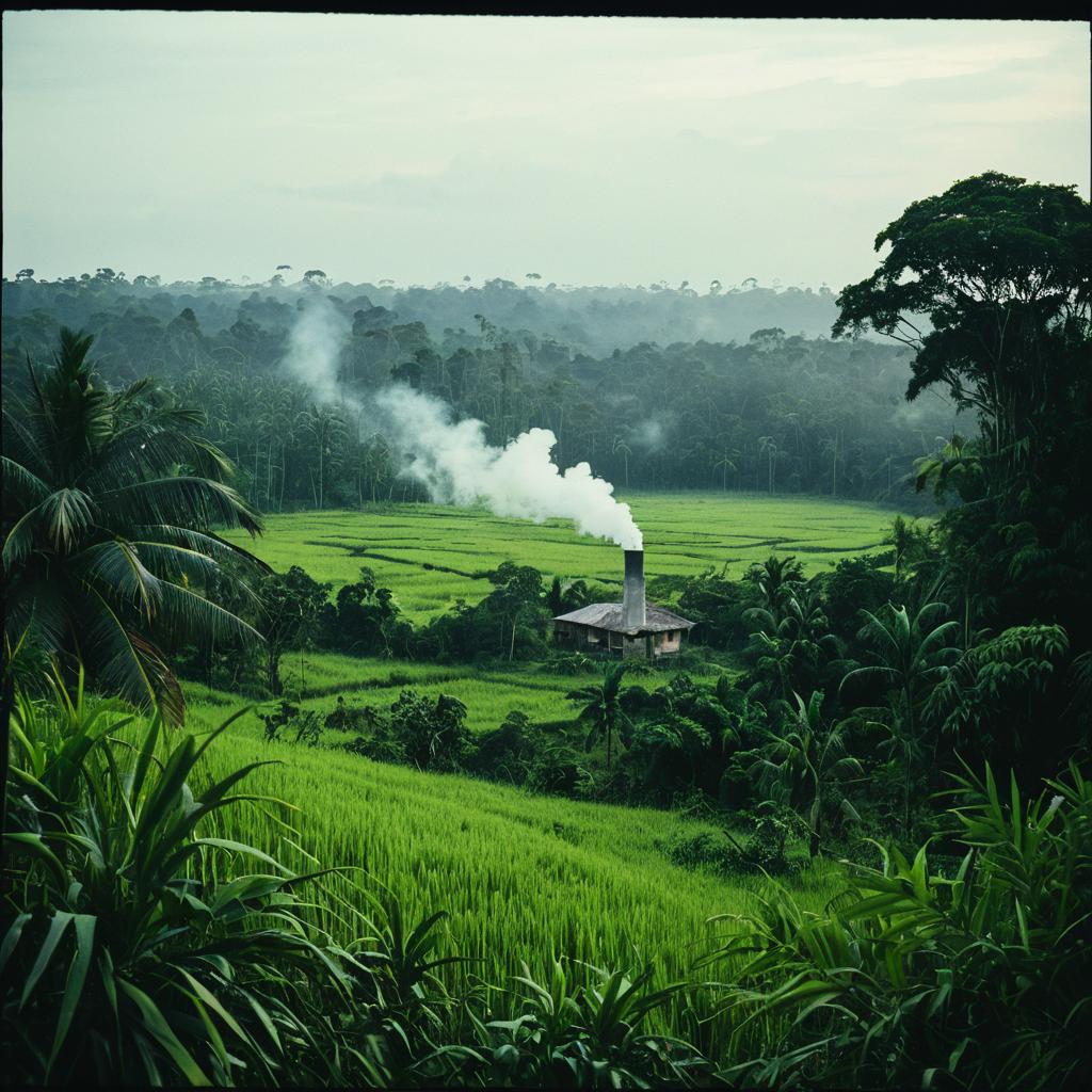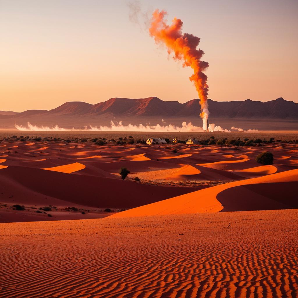 Dreamlike landscape, crimson sand dunes at sunset, fiery reds and oranges, Namibia with fields of wheat, distant house, light smoke from chimney, far away, hazy, glowing, photorealistic, gaussian, taken on Canon 5D
