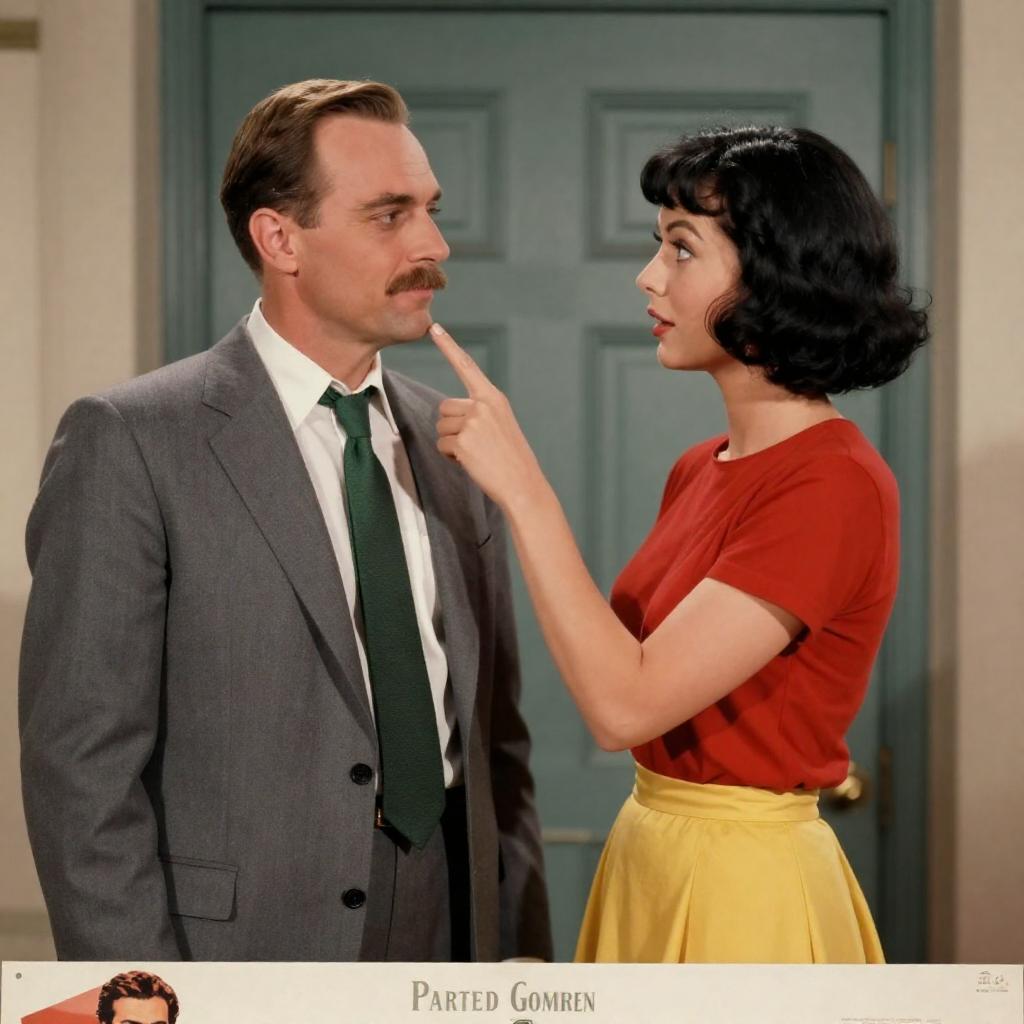 Color vintage movie still featuring a woman with short black hair, wearing a red top and yellow skirt, playfully pinching the cheek of a man with brown hair and mustache, dressed in a gray suit and green tie. They stand indoors in front of a green door, with the man's neutral expression contrasting the woman's playful demeanor. The scene includes a partial movie poster titled 'Parted Gomren' visible at the bottom.