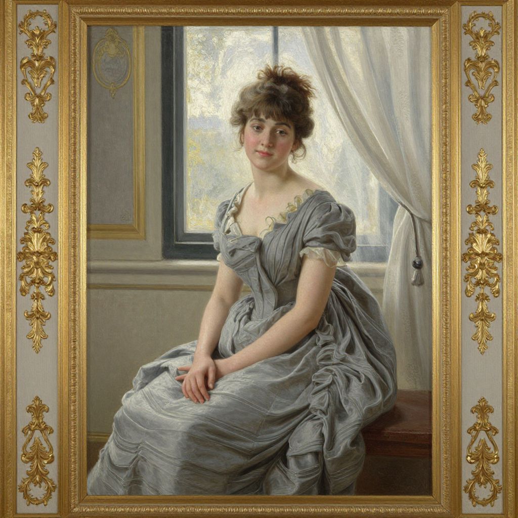 A finely detailed oil painting by Franz Ludwig Kiederich, showcasing a woman in a serene gray gown seated by a window, framed by ornate gold embellishments and bathed in soft natural light, capturing a vintage elegance and timeless grace.