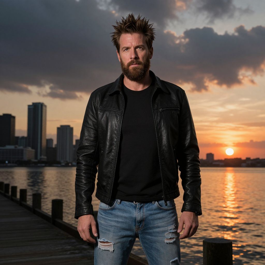 Vibrant, highly saturated photograph, man standing on an oversized map of Palm Beach, bright colors accentuating coastal features, landmarks, buildings, and palm trees, bold strokes creating a surrealistic effect, oversaturated hues emphasizing details, dynamic composition, shallow depth of field, soft focus, dreamlike ambiance. Man has masculine face and piercing eyes