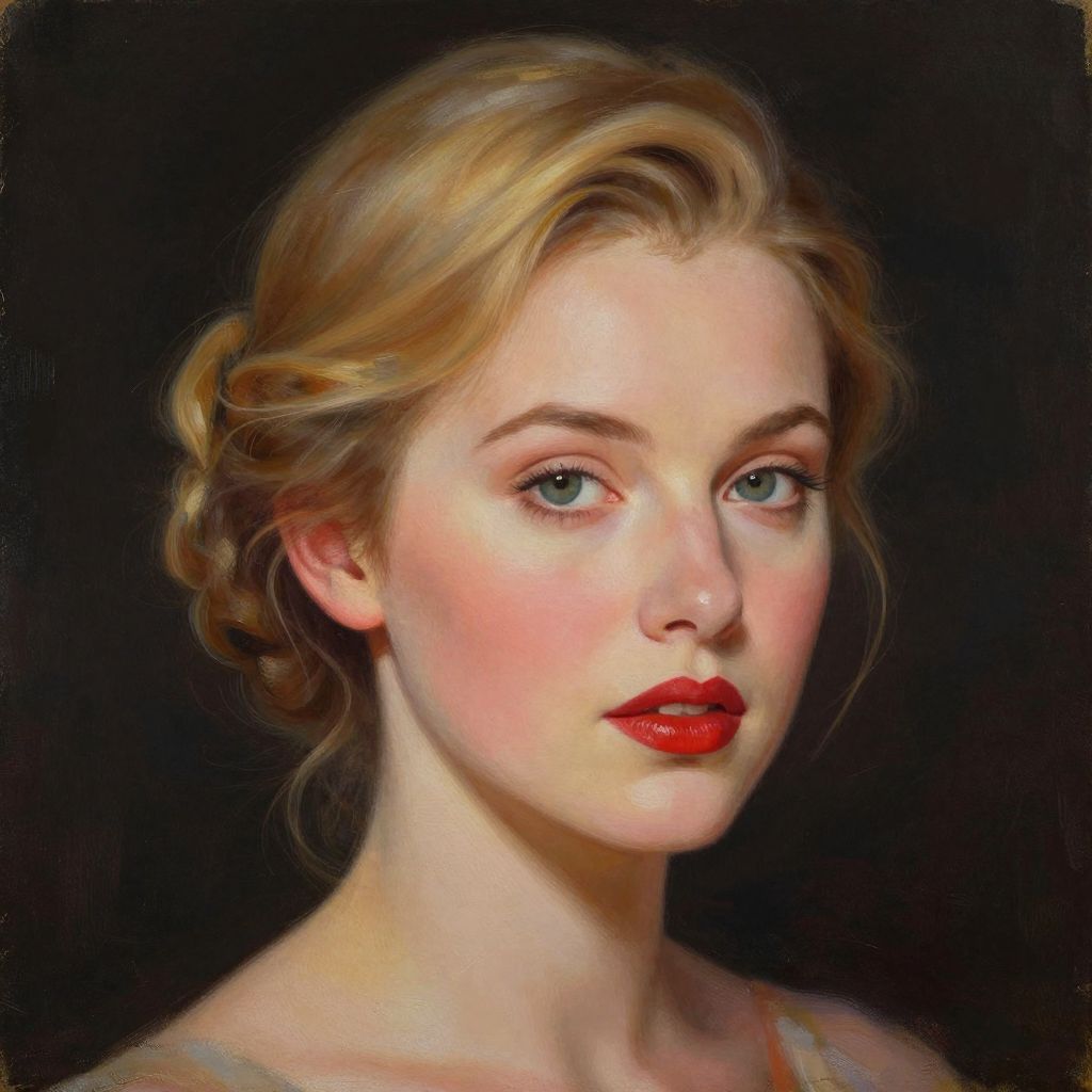 A hyper-realistic digital illustration featuring a woman with golden hair styled in an elegant updo, showcasing soft blush tones and vibrant red lips against a dark background, rendered with the meticulous detail and texture reminiscent of an oil painting by Mary Jane Ansell.