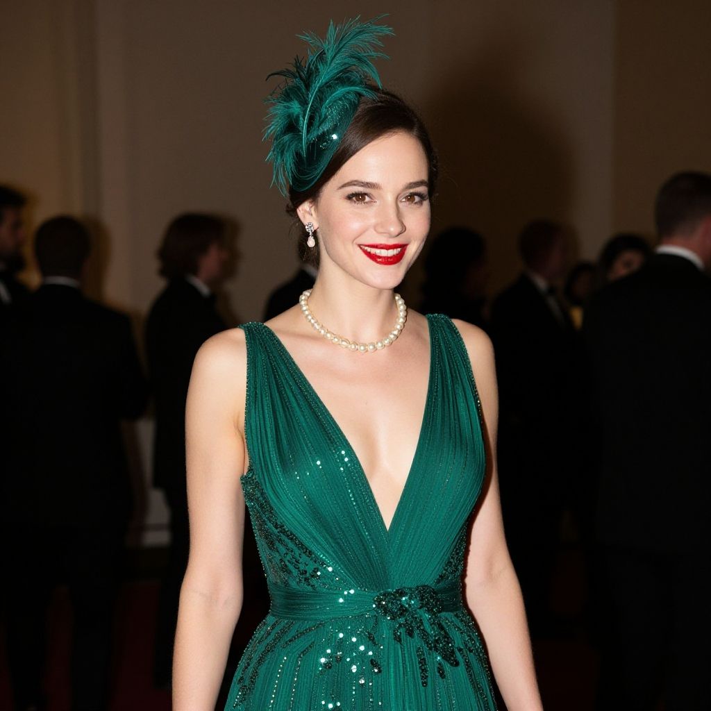 Photograph of a fair-skinned woman with dark hair in an updo, adorned with a teal feather headpiece. She wears a deep V-neck, sleeveless, emerald green gown with sequins, a pearl necklace, and bold red lipstick. Her makeup is glamorous, and she smiles confidently. The background is dark and blurred, featuring indistinct silhouettes of people in formal attire, suggesting a gala or evening event. The lighting highlights her face and dress, creating a stark contrast against the dark background. The overall style is elegant and sophisticated.