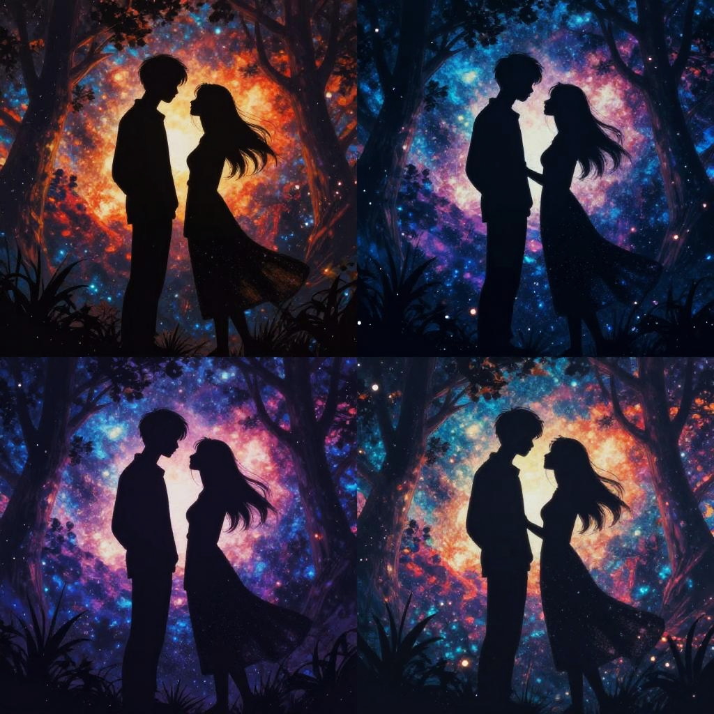 A digital artwork divided into four panels, each featuring silhouettes of couples in a vibrant, cosmic forest. The background is a colorful mix of blues, purples, oranges, and reds, resembling a galaxy with star-like specks. The couples are depicted in different poses: standing, facing each other, and kissing. The silhouettes are dark and contrast sharply against the bright, colorful backdrop.