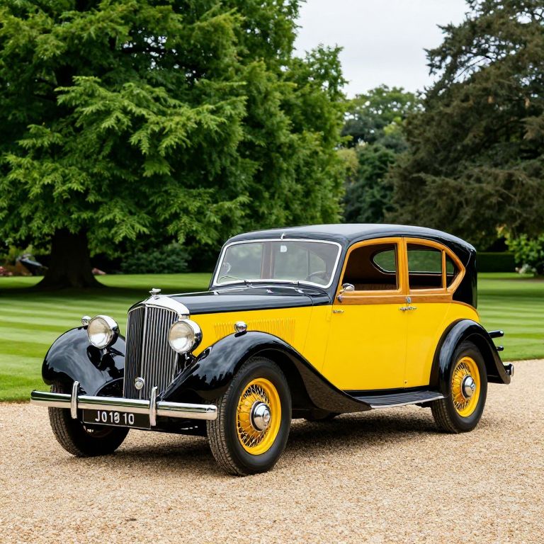 Stately 1937 Bentley 4¼-Litre 'Woodie' Shooting Brake, chassis no. B142JD, gleams in polished black and vibrant yellow, parked gracefully on gravel before a serene backdrop of lush green trees and manicured lawns.