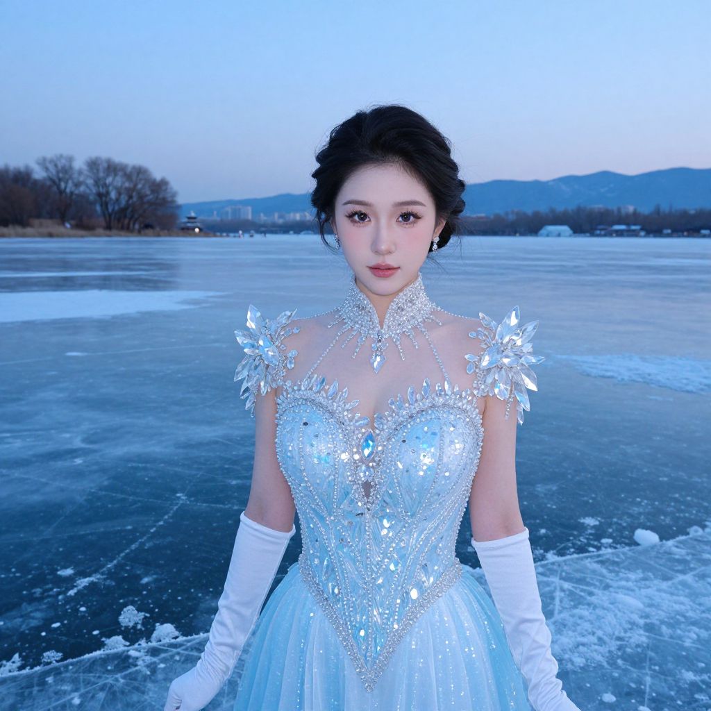 Photograph of an East Asian woman with fair skin and black, wavy hair styled up, standing in front of a frozen lake at dusk. She wears a sparkling, white, ice-themed ball gown with silver floral embellishments, sheer shoulders, and long white gloves. Her makeup is delicate, with subtle pink lipstick and dark eyeliner. The background features a blue-tinted sky, distant mountains, and leafless trees. The icy ground around her contrasts with her shimmering dress, creating a striking visual. The overall tone is cool and ethereal.