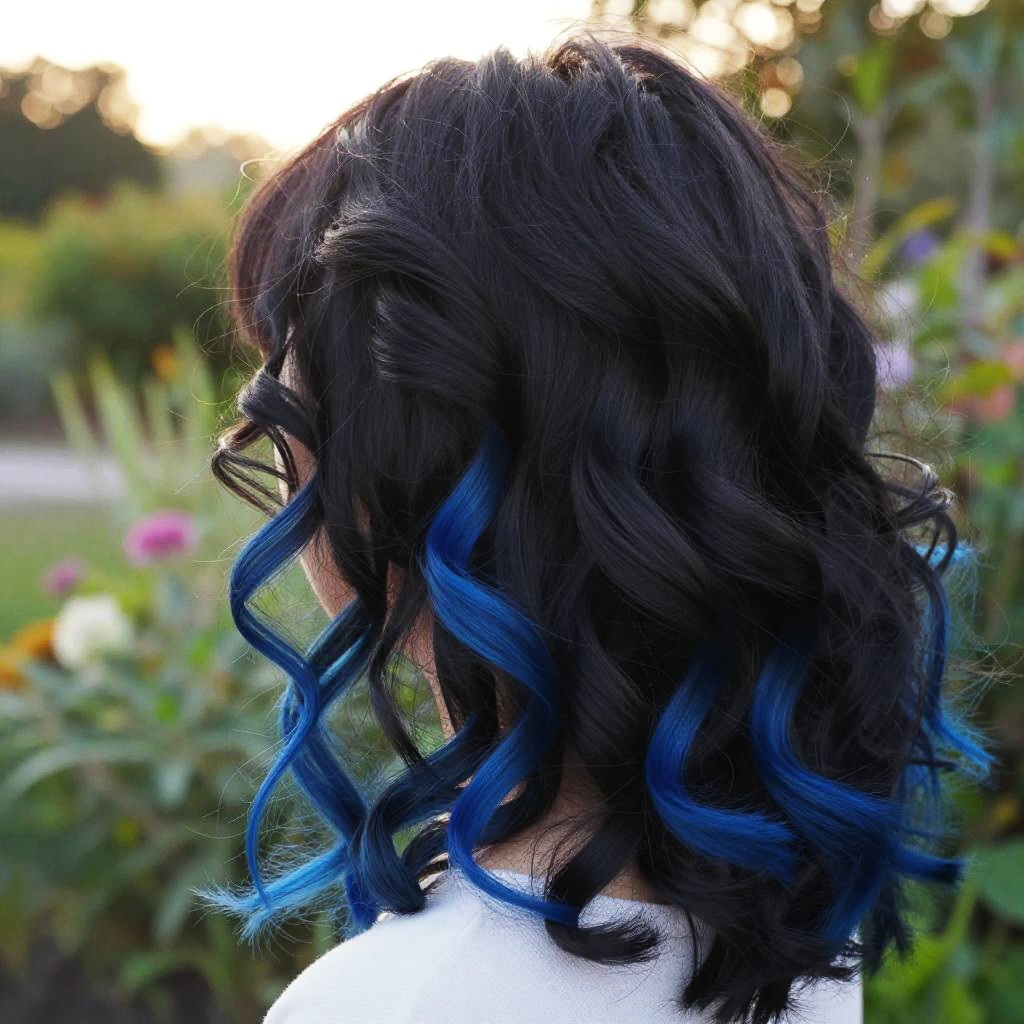 Black hair with blue roots artistically styled into loose curls, with a soft-focus garden background at golden hour, capturing natural light that subtly emphasizes the vibrant blue tones merged with deep black strands, evoking a dreamy, whimsical vibe.