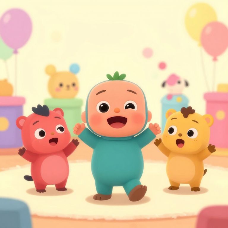 Cocomelon goofy ahh characters in a colorful animated nursery setting, with exaggerated silly expressions, playful poses, bright pastel colors, whimsical background full of toys and balloons, cheerful and humorous mood, digital illustration style