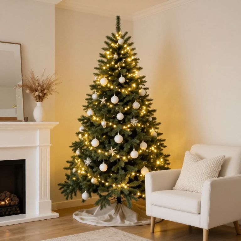 Cozy living room warmly illuminated by a tall, fully decorated Christmas tree adorned with golden lights and white ornaments, positioned centrally between a fireplace mantel with a vase of dried flowers and a white armchair with two textured pillows, all set against a soft beige wall and wooden flooring.