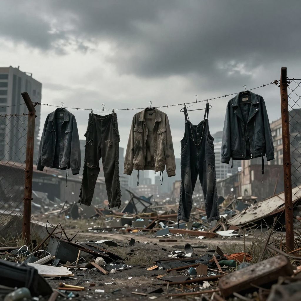 Rundown clothing hanging on a rusty wire fence in a desolate post-apocalyptic cityscape, overcast sky, debris scattered around, dramatic lighting, dystopian vibe