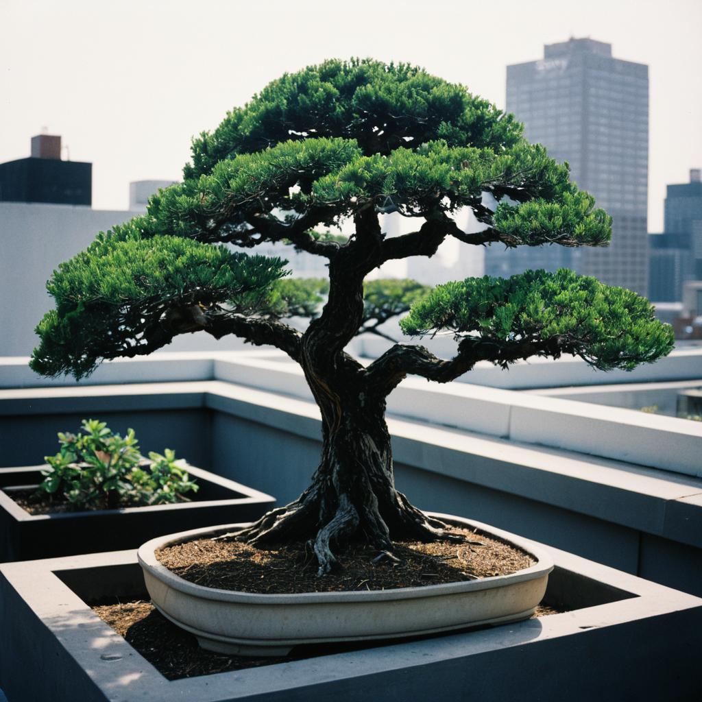 Gnarled Bonsai Tree on Urban Rooftop