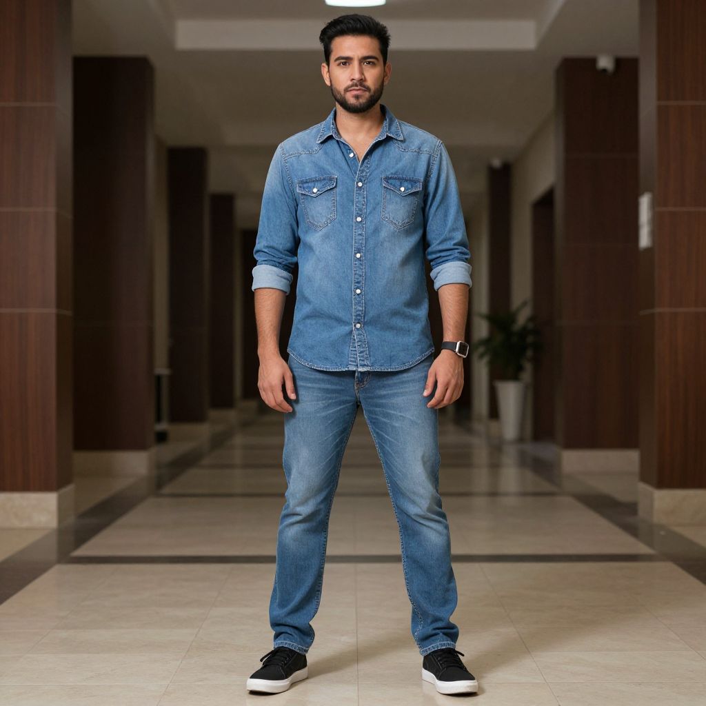 Man Jeans Style Costume, man in a blue shirt and jeans standing in a hall