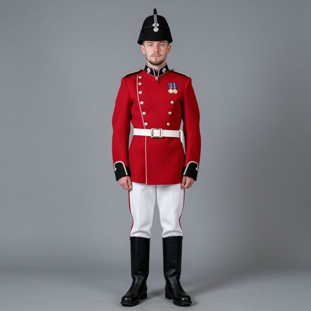 British red coat soldier, solo, 1boy, male focus, uniform, epaulettes, boots, military uniform, hat, military, white pants, full body, black footwear, standing, pants, belt, jacket, arms at sides, long sleeves, simple background, grey background, medal, knee boots, facial hair