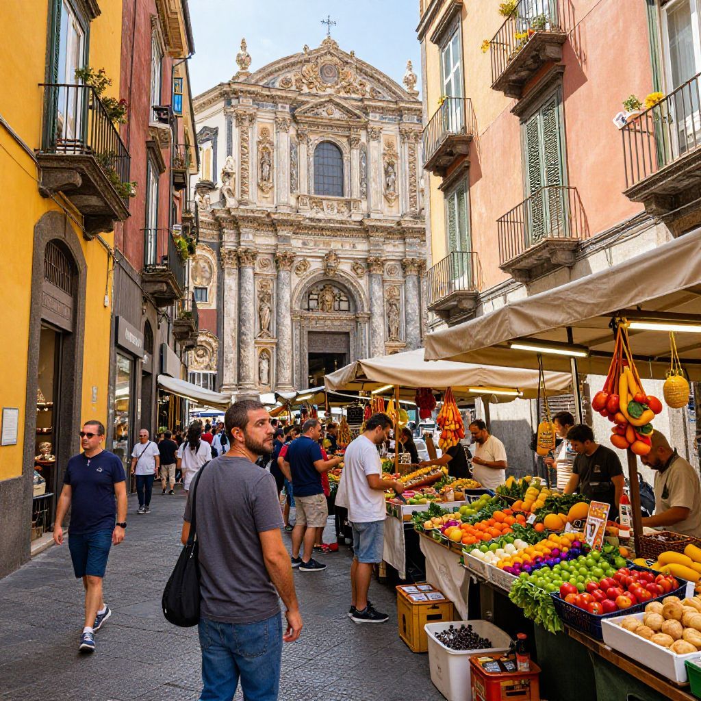 Vibrant street scene in Naples, Italy: a man explores the colorful alleys, admiring the ornate Baroque architecture, rich history, and energetic market stalls filled with fresh produce, artisanal goods, and mouthwatering Italian cuisine. Oversaturated colors accentuate the warm sunlight, lively chatter, and aromatic scents wafting through Man has masculine face and piercing eyes