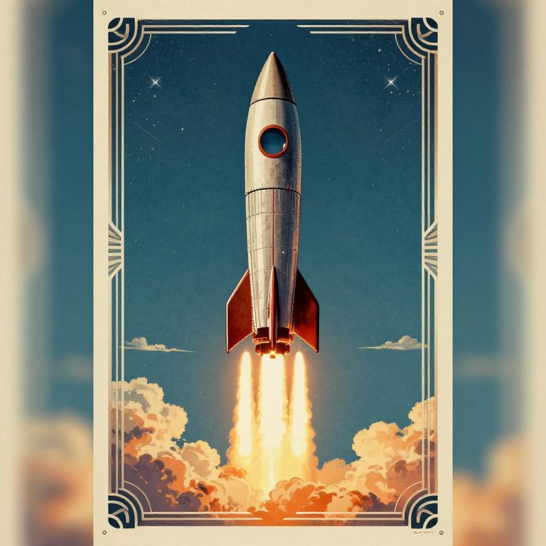 A vintage-style poster depicts a rocket ship blasting off straight up into the sky, with a classic 1940s sci-fi design and art deco elements.