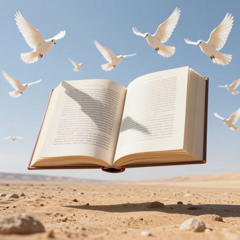 Giant open book levitates gracefully above a barren desert landscape, its pages illuminated by sunlight as a flock of white doves flutters around it, casting delicate shadows upon the text.