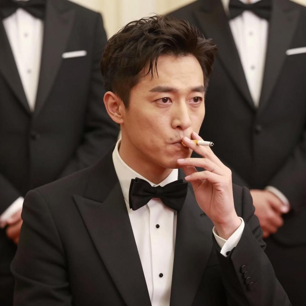 A man with dark hair in a black tuxedo, holding a cigarette to his mouth, looking slightly to the side. He wears a black bow tie and white dress shirt. In the background, two other men in tuxedos, one with a white pocket square, stand partially visible. One man on the right holds a small object in his hand.