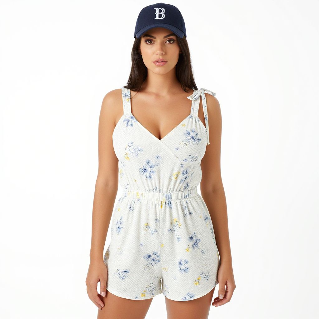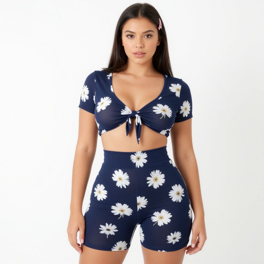 "Woman, casual summer style, navy blue two-piece outfit with large white daisy print, scoop neck crop top with a knot detail at the bust, matching high-waisted bike shorts, minimal makeup, simple pink hair clip on the side, white background. Sexy. Pretty face and beаutiful eyes. Big breasts."