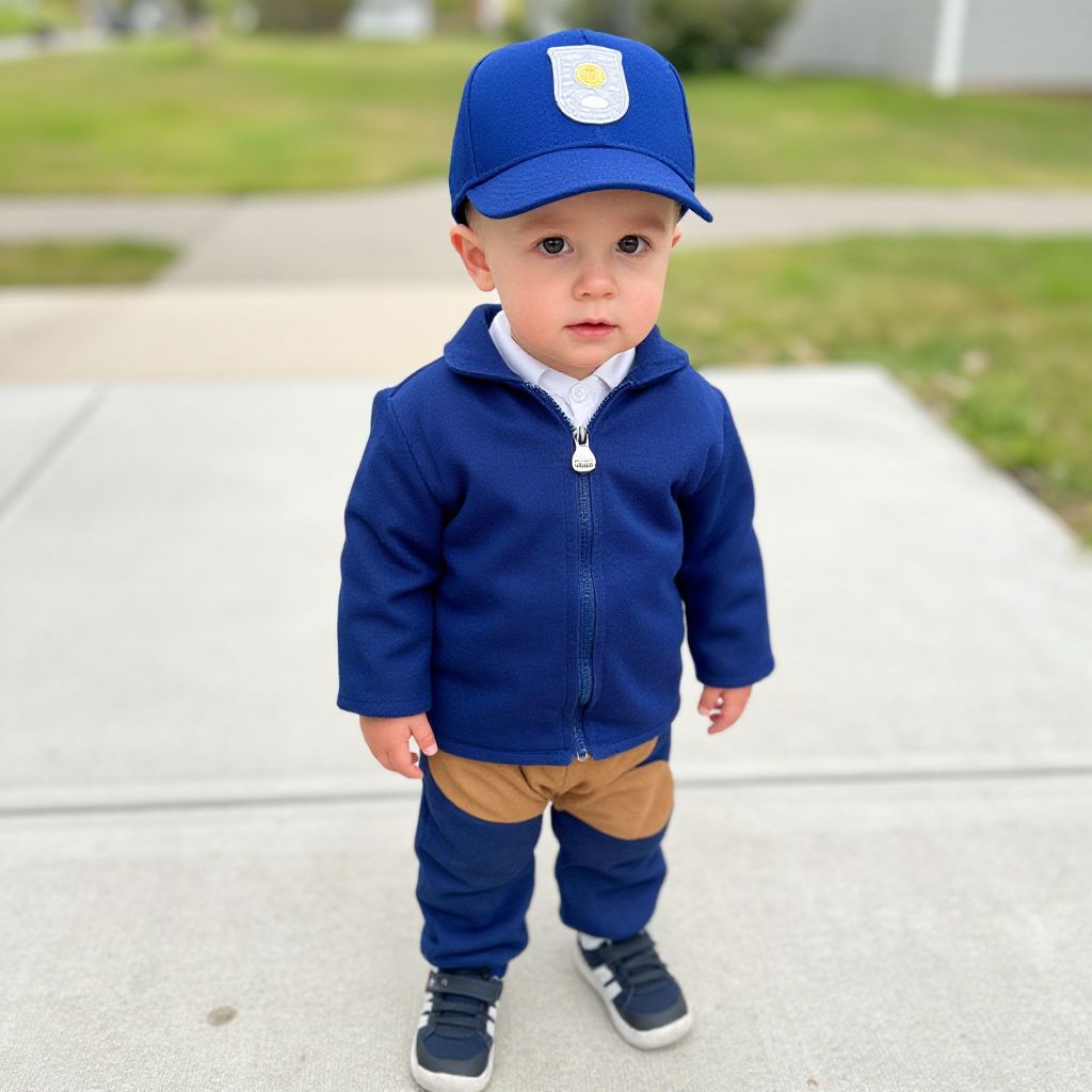 Toddler Postman Costume, young boy wearing a hat and jacket standing on the sidewalk