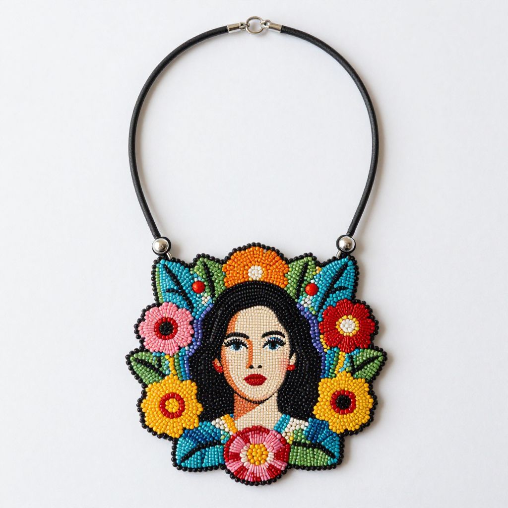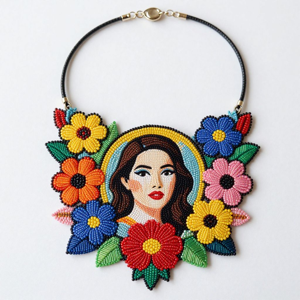 Bead-embroidered necklace featuring a vibrant floral design encircling a detailed portrait of a woman's face, crafted with colorful beads in shades of yellow, red, blue, green, and pink, set against a clean white background.