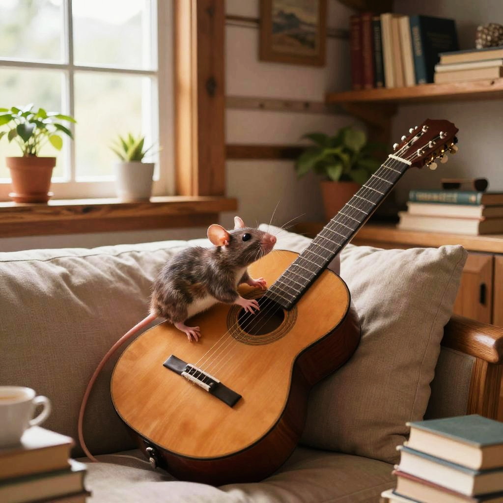 Rat playing classical guitar inside a cozy, rustic cabin filled with books and plants, warm natural light from a window, detailed wooden textures on guitar and furniture, charming and intimate scene, soft pastel color palette with gentle shadows
