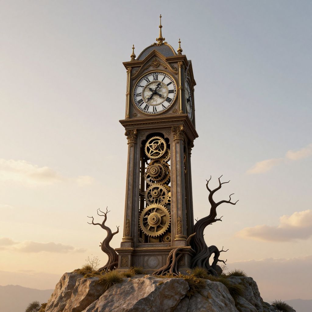 An ethereal 3D-rendered clocktower emerges from a rocky outcrop, its intricate Roman numeral faces and mechanical gears blending seamlessly with gnarled tree branches, evoking a surreal, vintage fantasy aesthetic as it stands against a serene, golden-hour sky.