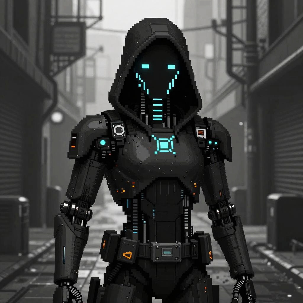 Black pixel art showcasing a cyberpunk character in a dystopian alley, wearing a dark hood and glowing cybernetic implants, high contrast to emphasize shapes, detailed pixel shading, inspired by vintage arcade game visuals, gritty and atmospheric.