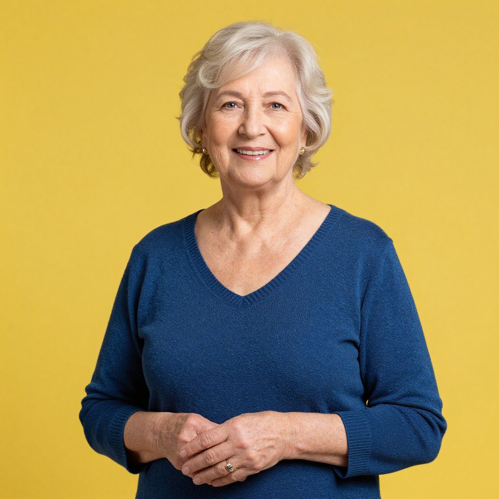 Photograph of an elderly woman with short, white, wavy hair, smiling gently. She has light skin and wears a navy blue, long-sleeved V-neck sweater. She is standing against a bright yellow background, which contrasts with her dark top. Her hands are clasped in front of her, displaying a gold ring on her right hand. The image is well-lit, highlighting her warm expression and soft wrinkles. The overall style is simple and elegant, focusing on her serene presence and the vibrant background.