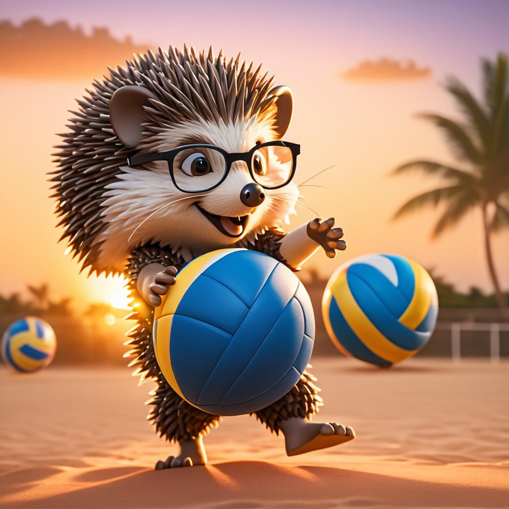A hedgehog wearing glasses playing volleyball at sunset. The scene captures a playful atmosphere with dynamic action.