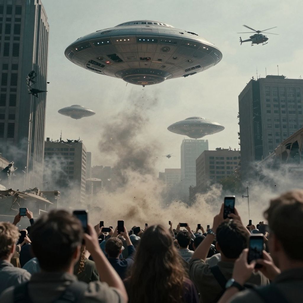 Photograph of a bustling city street filled with a large crowd of people taking photos. Above, several UFOs hover, emitting smoke. A helicopter flies in the background. Tall skyscrapers frame the scene on both sides. The crowd, dressed in casual clothing, faces forward, capturing the moment with smartphones. The sky is overcast, adding a dramatic, sci-fi feel to the urban setting. The UFOs are circular with lights on their undersides. The overall atmosphere is tense and awe-inspiring.