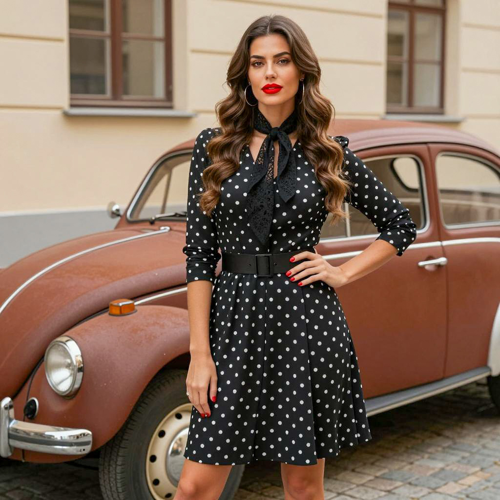 Woman with long wavy brown hair, red lipstick, wearing a black polka dot dress with a black belt, black lace scarf, standing in front of a rust-colored vintage car, beige building with windows in the background. Cobblestone street. Confident pose.