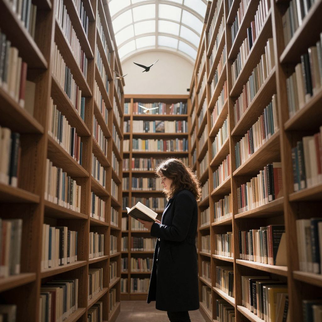 Books flutter like birds through the air as a woman in a dark coat stands between towering wooden shelves, reading an open book while sunlight streams through the arched ceiling above, casting a serene glow over the library's tranquil scene.