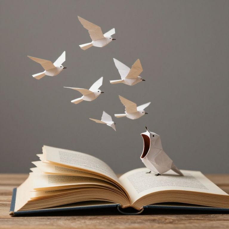 A yawning book spews miniature paper birds that flap their pages into wind, building a temporary narrator out of fluttering knowledge.