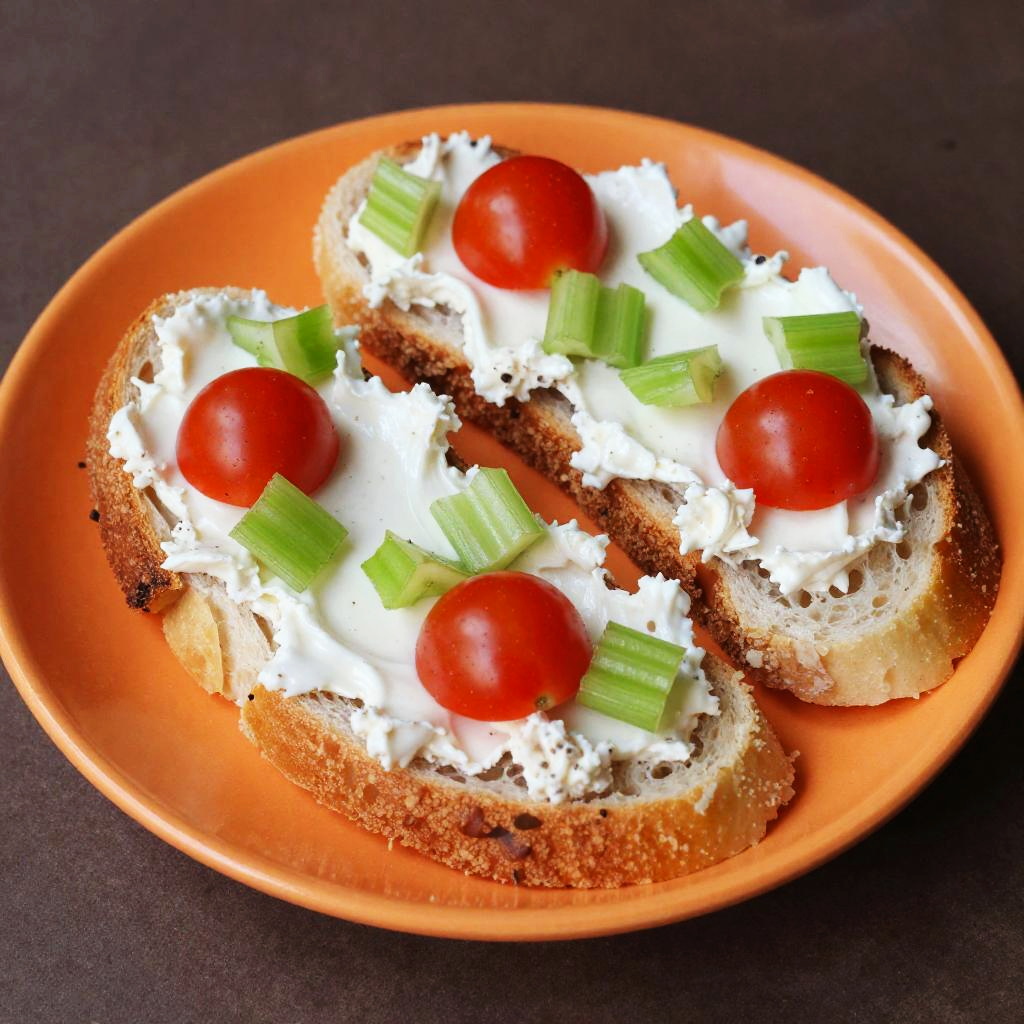 Photograph of three slices of bread topped with a creamy white spread, dotted with bright red cherry tomatoes and green celery pieces. The bread slices are arranged on an orange plate, creating a vibrant contrast. The background is a dark brown, textured surface, adding depth to the image. The spread looks chunky and fresh, with a slightly crumbly texture.