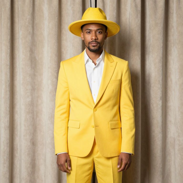 Yellow Pimp, dressed in a yellow suit and hat standing in front of a curtain