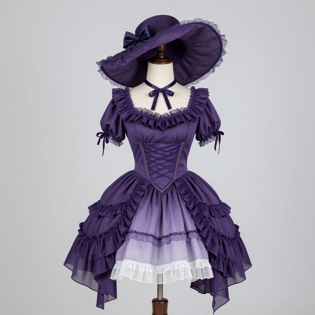 Photograph of a vintage-style, gothic Victorian dress displayed on a black dress form. The dress is predominantly dark purple with intricate lace detailing and ruffles. It has puffed short sleeves adorned with black ribbon bows, a high-neck with a small black ribbon bow, and a fitted, corset-like bodice with crisscross lacing. The skirt is layered with ruffles and lace, transitioning to a sheer, white lace hem. The dress is complemented by a large, dark purple, wide-brimmed hat with lace trim and a small bow on the side. The background is a plain, gradient white.
