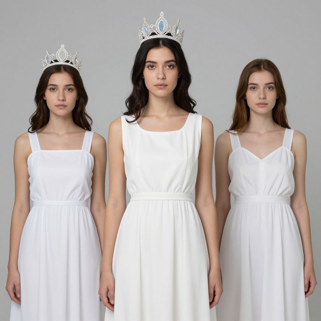 Photograph of three young women standing against a plain gray background, wearing identical white, sleeveless, ankle-length dresses with square necklines. Each woman has a silver, ornate tiara on her head. The woman in the center has shoulder-length, wavy black hair, while the women on the left and right have straight, shoulder-length brown hair. They all have fair skin and are looking directly at the camera with neutral expressions. The dresses are simple and elegant, contrasting with the intricate designs of the tiaras. The image has a clean, minimalistic style.