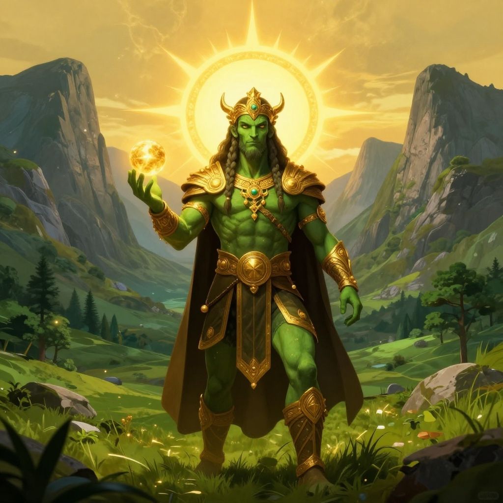 Digital illustration of Dagda, the Celtic god of fertility, wisdom, and magic. The figure is depicted with green skin, long braided hair, and golden ornamental armor and jewelry. He stands in a lush green valley flanked by towering gray mountains, with a large golden sun or halo behind his head. He holds golden orbs in both hands, symbolizing his divine power. The atmosphere is mystical and vibrant, set under a glowing golden sky.