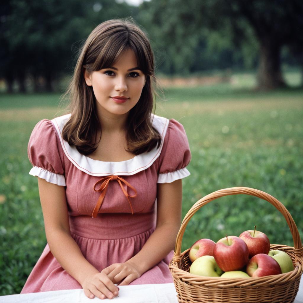 A young woman with short brown hair and brown eyes wearing a classic German-inspired red dress with puffed sleeves and pantyhose. She is standing indoors in a living room featuring a brown leather sofa, white pillow, and a side table with a lamp and framed picture on the wall.
