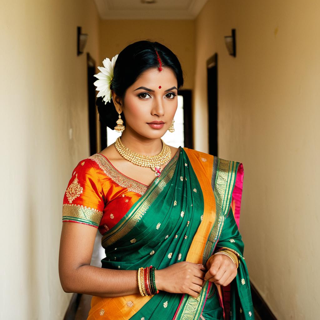 Portrait of an Indian woman wearing a green, orange, and pink traditional silk saree with gold detailing. She has a red bindi on her forehead and is adorned with intricate gold jewelry including a necklace, earrings, and bangles. Her black hair is tied back with a white flower. The woman stands in a narrow hallway with beige walls, under natural daytime light, looking directly at the camera with a serious expression.