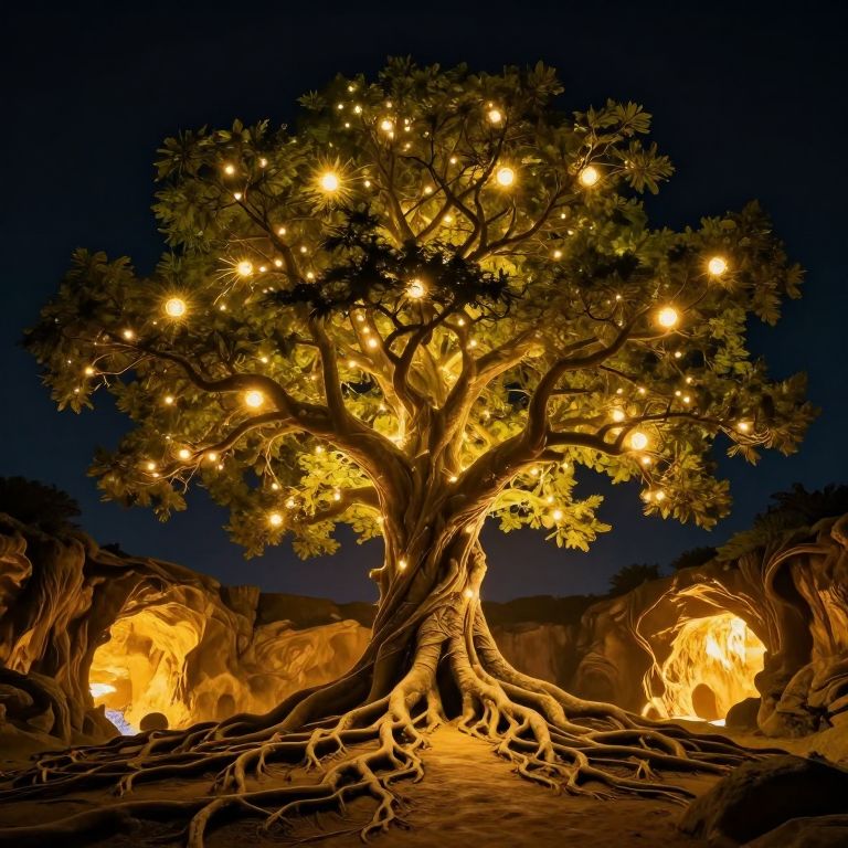 A majestic, luminous tree stands defiantly against the night sky, its branches adorned with glowing orbs that cast a warm, ethereal light, while its roots form a radiant pathway leading into a hidden, golden cavern beneath.